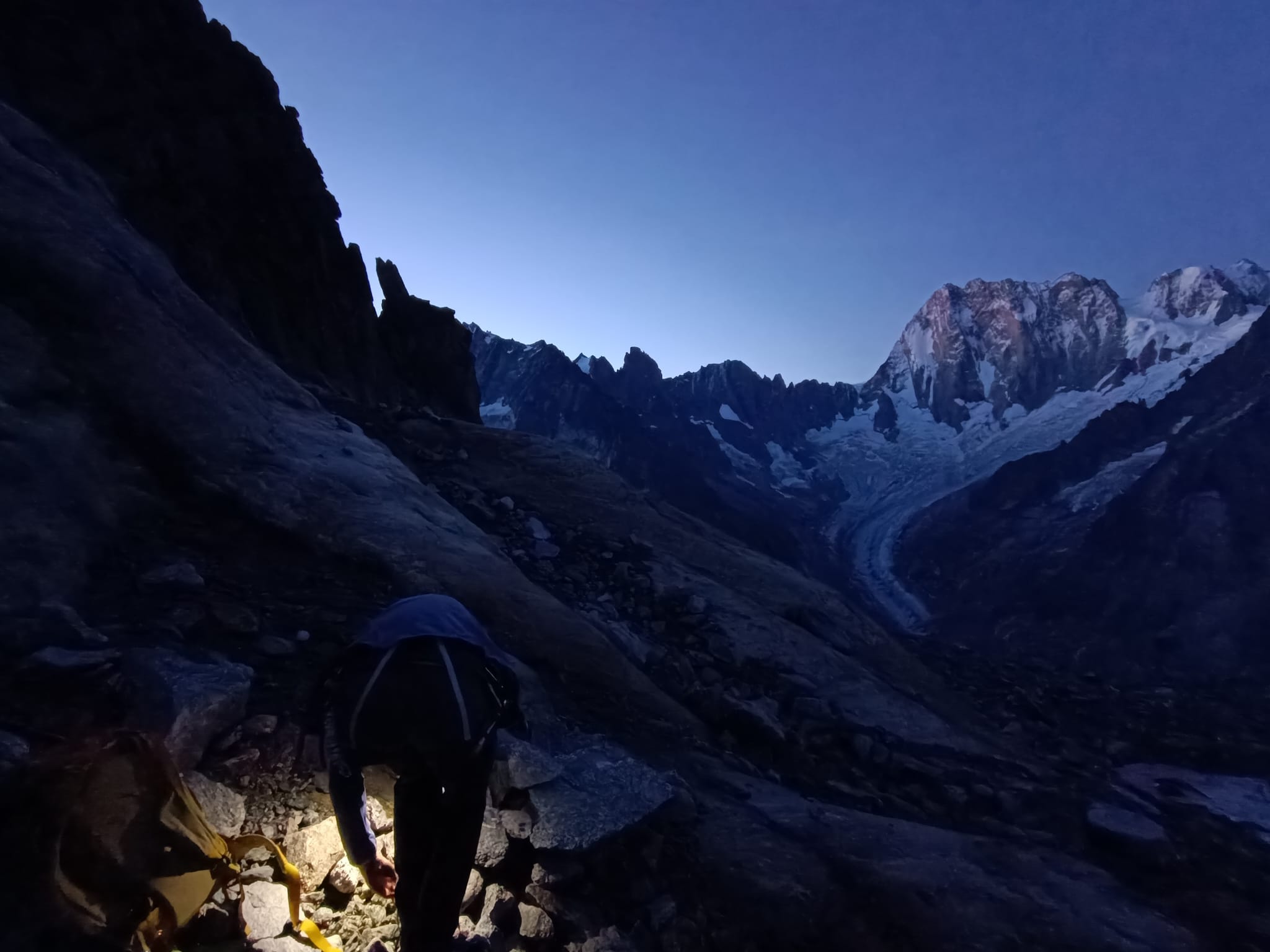 Le lendemain, lever matinal à 5h pour attaquer la belle aiguille du Moine. Après un départ rapide et l’approche du glacier, nous entamons les premières longueurs sur ce tas de cailloux.