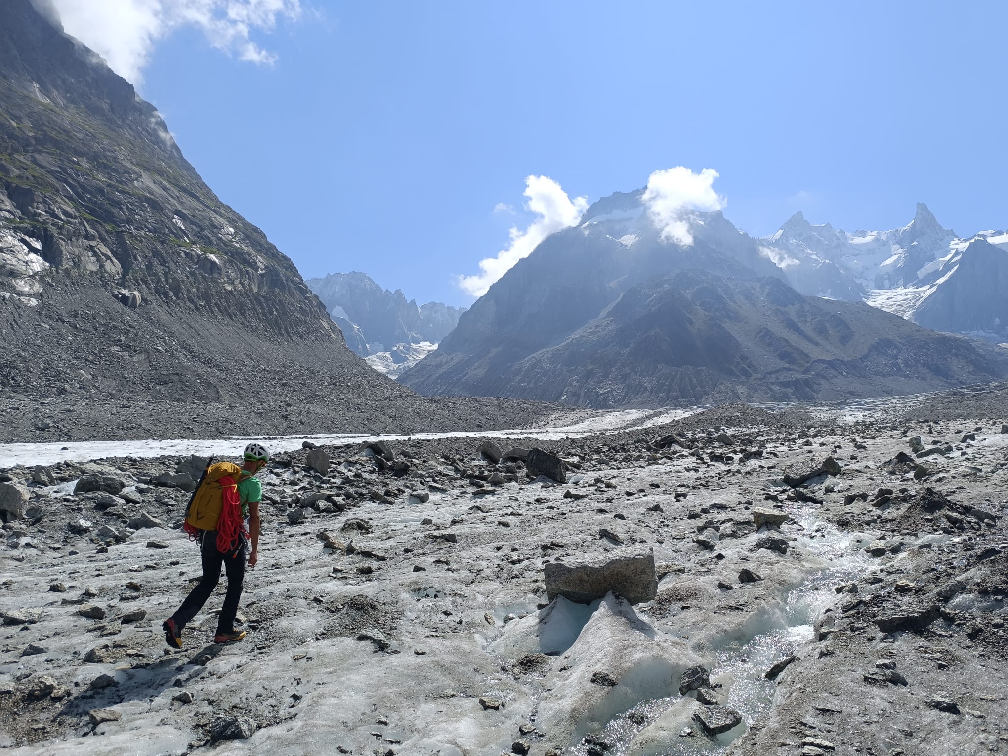 Retour au refuge, remplissage des gourdes, puis on repart à vive allure. On attaque les échelles pile au moment où la dernière cabine quitte le Montenvers… Résultat : un petit supplément de D+ et quelques kilomètres !