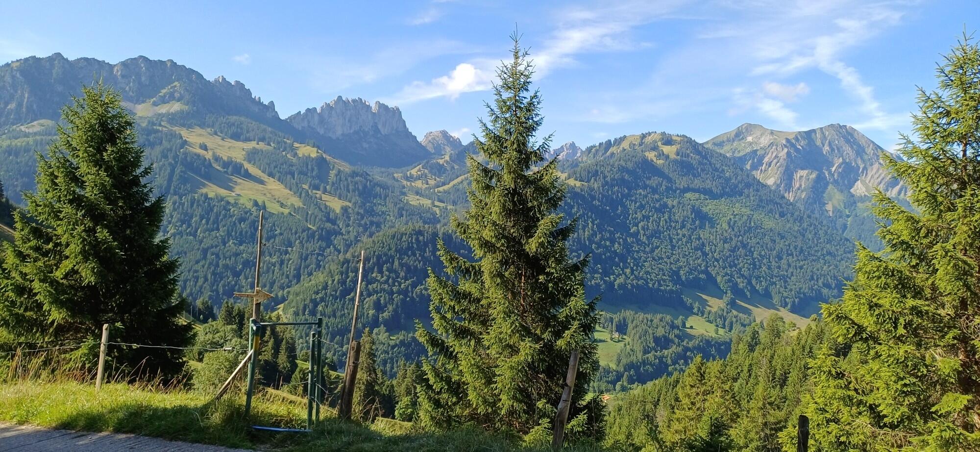 Après un pique-nique apprécié nous profitons d’une vue sur les alpes bernoises, malgré une légère couverture nuageuse, dont les Wildstrubel et le Wildhorn et plus près la longue chaine des Gasthlosen riche en voies d’escalades ainsi que sur le Schwarzsee plus bas dans la vallée.